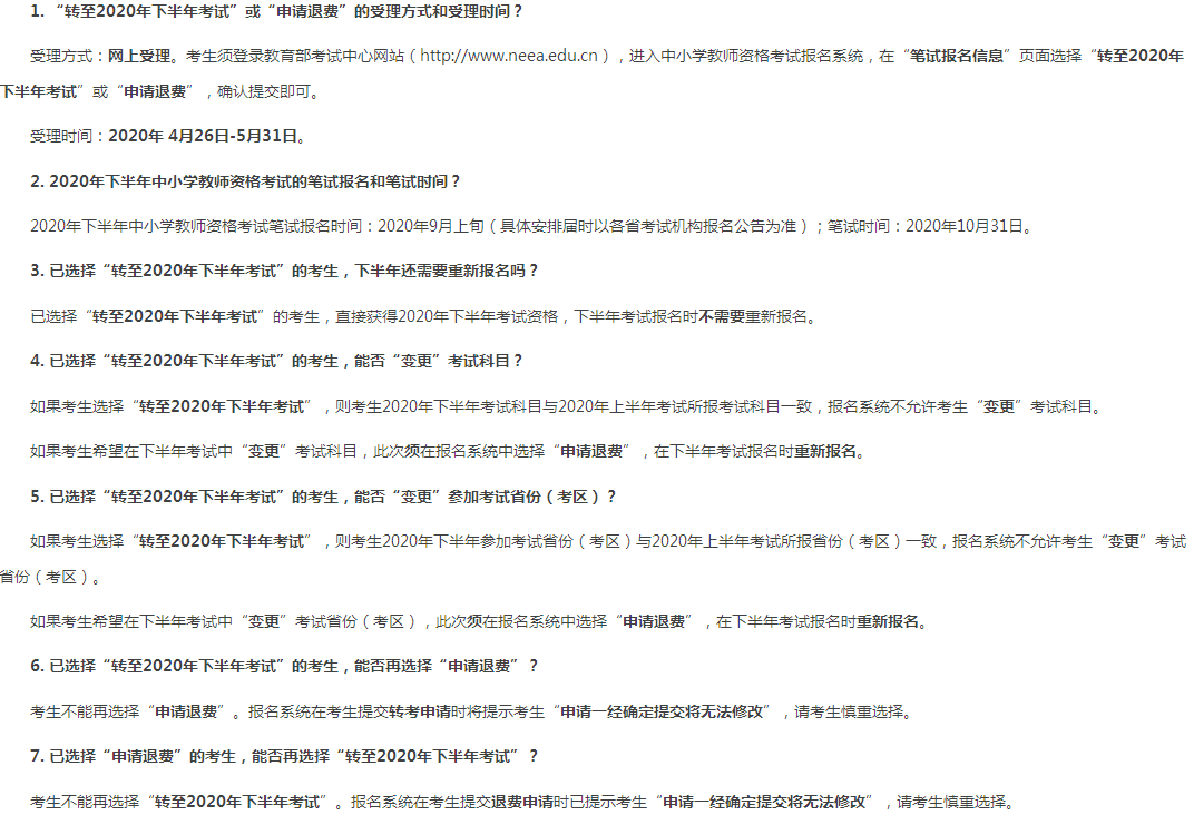 2020年4月24日教育部考试中心发布《关于将2020年上半年中小学教师资格考试推迟至下半年一一并组织实施的相关问题说明》: