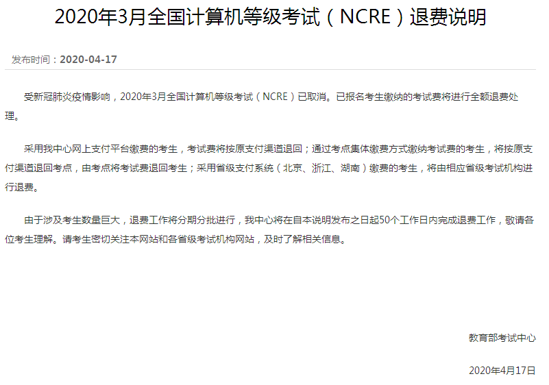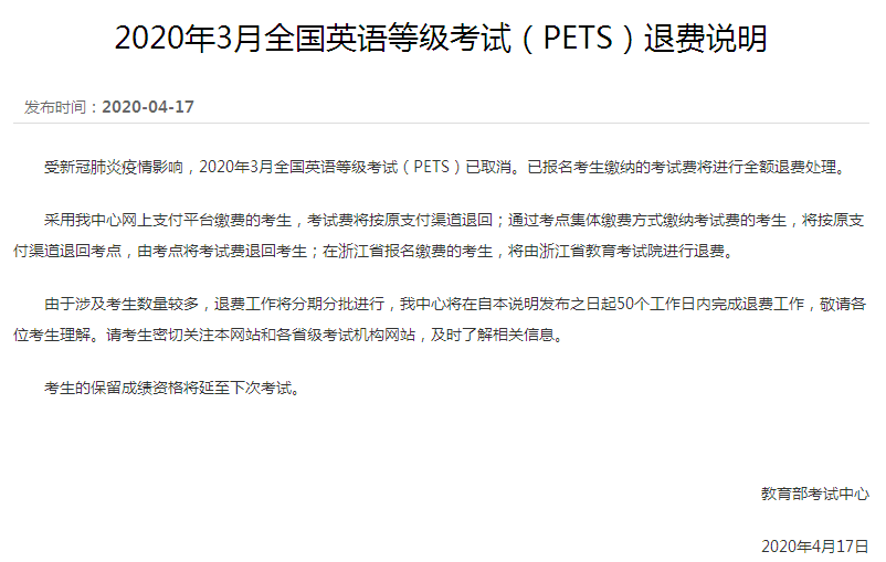 2020年4月16日教育部考试中心发布《关于调整2020年上半年部分考试的公告》、4月17日发布全国英语等级考试(PETS)与全国计算机等级考试(NCRE)退费说明:为落实国家关于新冠肺炎疫情防控工作部署及教育部相关通知要求,切实保障考生、考试工作人员的身体健康和生命安全,经研究决定,取消原定于2020年上半年举行的以下考试项目: