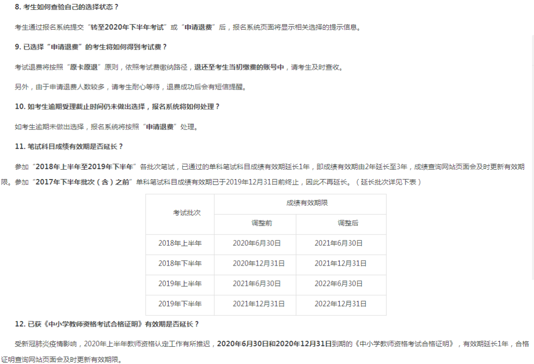 参加“2018年上半年至2019年下半年”各批次笔试,已通过的单科笔试科目成绩有效期延长1年,即成绩有效期由2年延长至3年,成绩查询网站页面会及时更新有效期限。参加“2017年下半年批次(含)之前”单科笔试科目成绩有效期已于2019年12月31日前终止,因此不再延长。2020年6月30日和2020年12月31日到期的《中小学教师资格考试合格证明》,有效期延长1年。