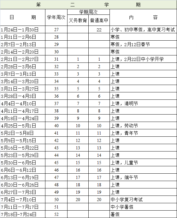 小学、初中寒假起始时间为2021年1月24日,普通高中为1月31日;2020-2021学年第二学期,普通中小学校统一于2021年2月22日开学,暑假起始时间为7月11日。各普通中小学校要严格按照校历开展教育教学活动。