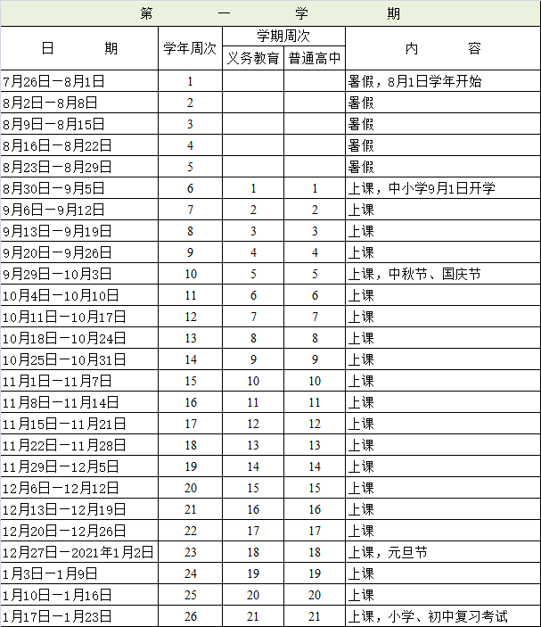 2020-2021学年第一学期,全市普通中小学校统一于2020年9月1日开学,高三年级可根据国家课程计划和学校实际教学安排,适当调整开学时间,于8月10日开始新学年开学。